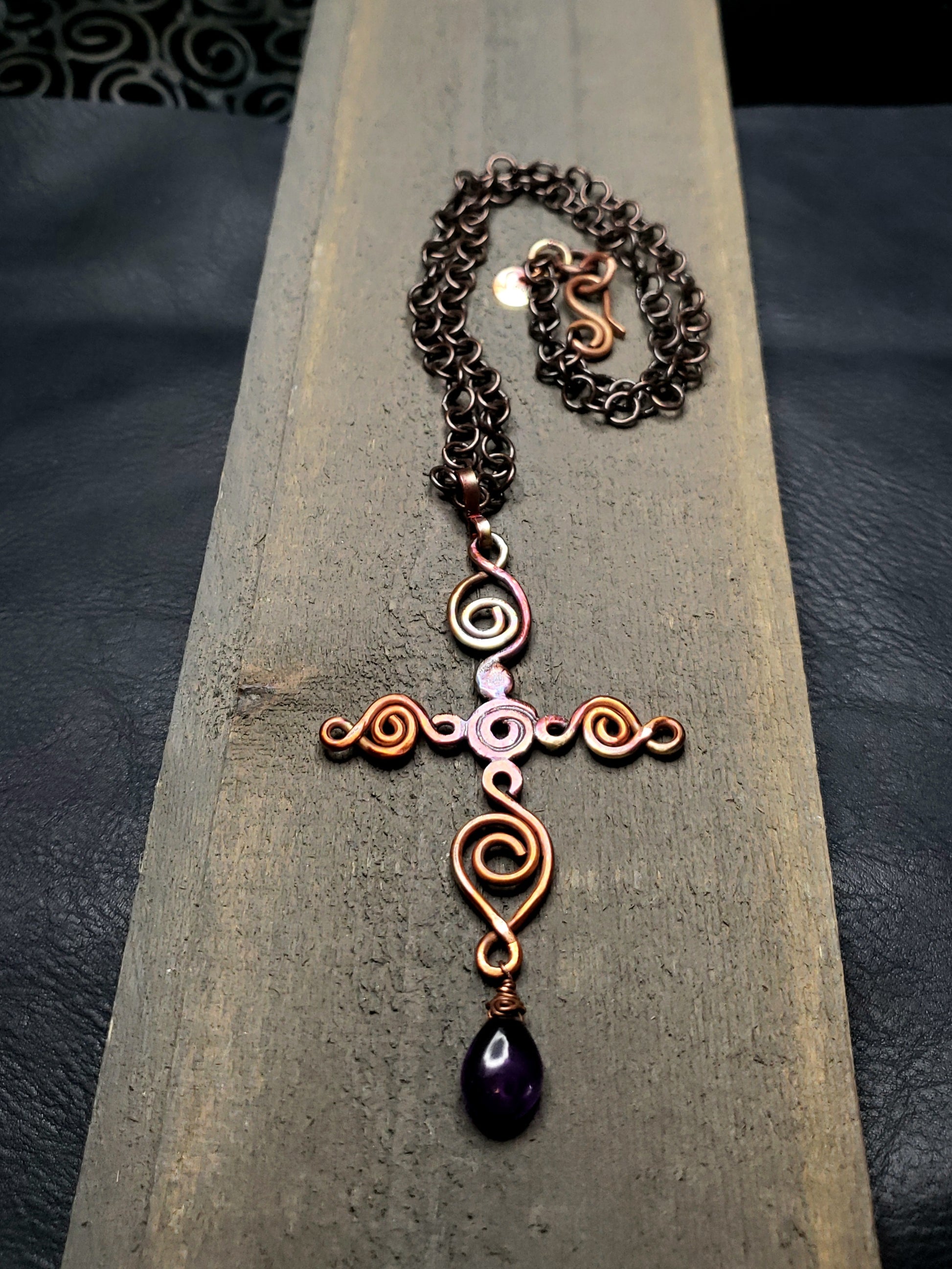 Handcrafted copper scroll cross featuring a beautiful fire patina finish, paired with a striking amethyst drop. This piece hangs from a 17" round link copper chain that complements the warm, oxidized tones of the cross. The amethyst adds a pop of purple elegance while the patina gives the copper an artisanal, one-of-a-kind character. Perfect for layering or wearing solo as a statement piece.